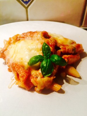 Nun die Nudeln auf zwei Schichten verteilen. Dazwischen kommt Sauce, Mozzarellascheiben und Parmesan.