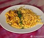 Pikantes Senfschnitzerl mit Gemüse und Nudeln